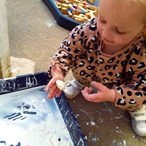 We promote free flow outdoor play supporting choice and extending children's learning and play. We believe there is no such thing as bad weather just the wrong type of clothing! The area is secure and the children are fully supervised at all times. We feel the outside area is important for encouraging active play and allows the children to investigate and explore their natural environment.